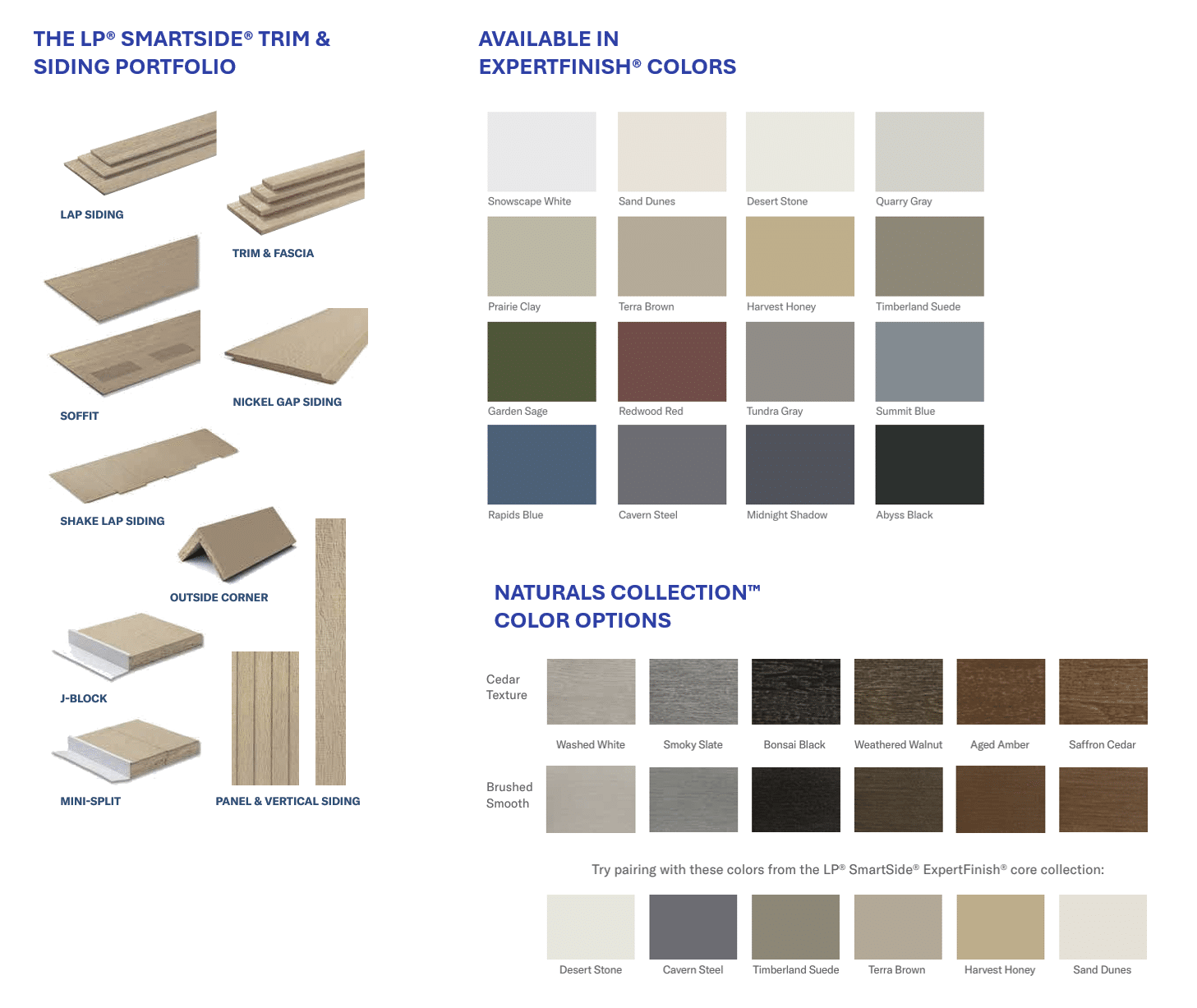 • Choose from primed products or prefinished offerings within our LP® SmartSide® ExpertFinish® color collection